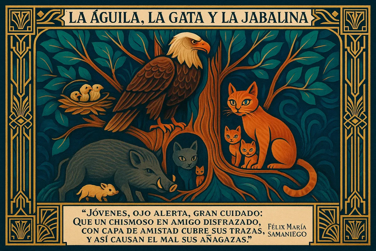 La fábula juega con la estructura vertical del árbol para mostrar cómo la gata—la más astuta y maliciosa—manipula tanto al ave como al animal terrestre para quedarse sola con comida (sus crías) y espacio.